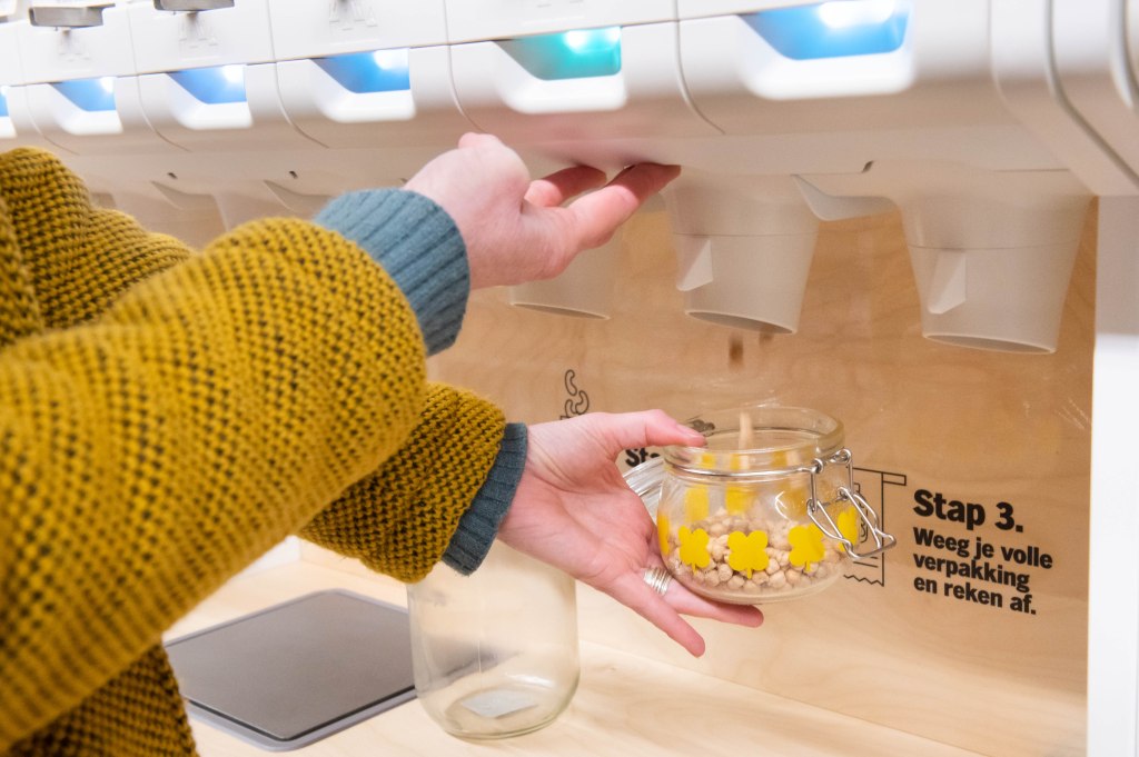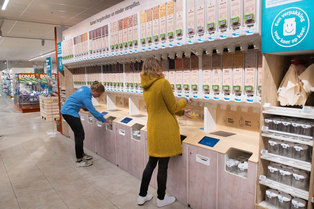 The Dutch supermarket chain Albert Heijn introduced a new concept that allows customers to fill reusable containers (bags or jars) with products like pasta, rice, muesli, tea, coffee or nuts, and use less plastic packaging. Customers can bring their own bags and jars or buy reusable containers at the supermarket.
